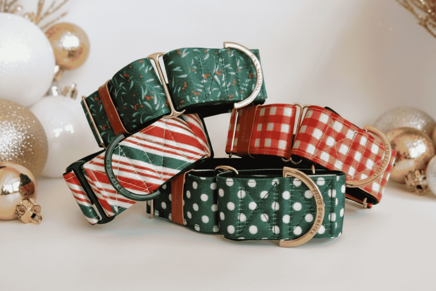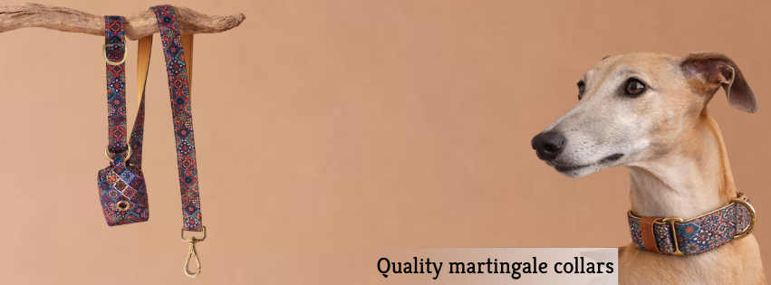 There's no need to comprise style for practicality, martingale collars traditionally worn by sighthounds such as Greyhounds, Whippets, Italian greyhounds because they are less likely to slip off due to their heads being more narrow than their necks. Martingale collars are not only beautiful they are the perfect training collar that gently give you more control while out walking. Our standard martingale collars are lightweight with no heavy buckle weighing down on the neck or compromising the strength of the collar, this also makes them ideal for strong dogs like Great Danes, Wolfhounds & Dobermans.