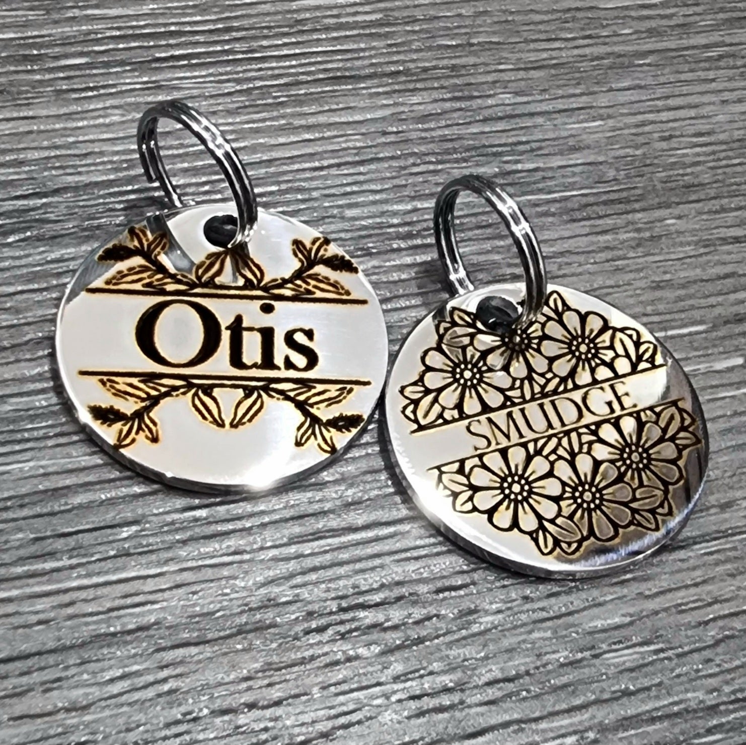 The GINGER Dog Tag. Meticulously crafted, this tag features a deep engraving of your beloved hound's name on the front bordered by subtle gingle flowers. The tag’s surface shines with a luxurious shiny finish, contrasted by sleek black infill that enhances its striking design. With a diameter of 30mm and a robust 2mm thickness, The Ginger is built to withstand daily wear, offering superior strength compared to traditional, flimsy dog tags.